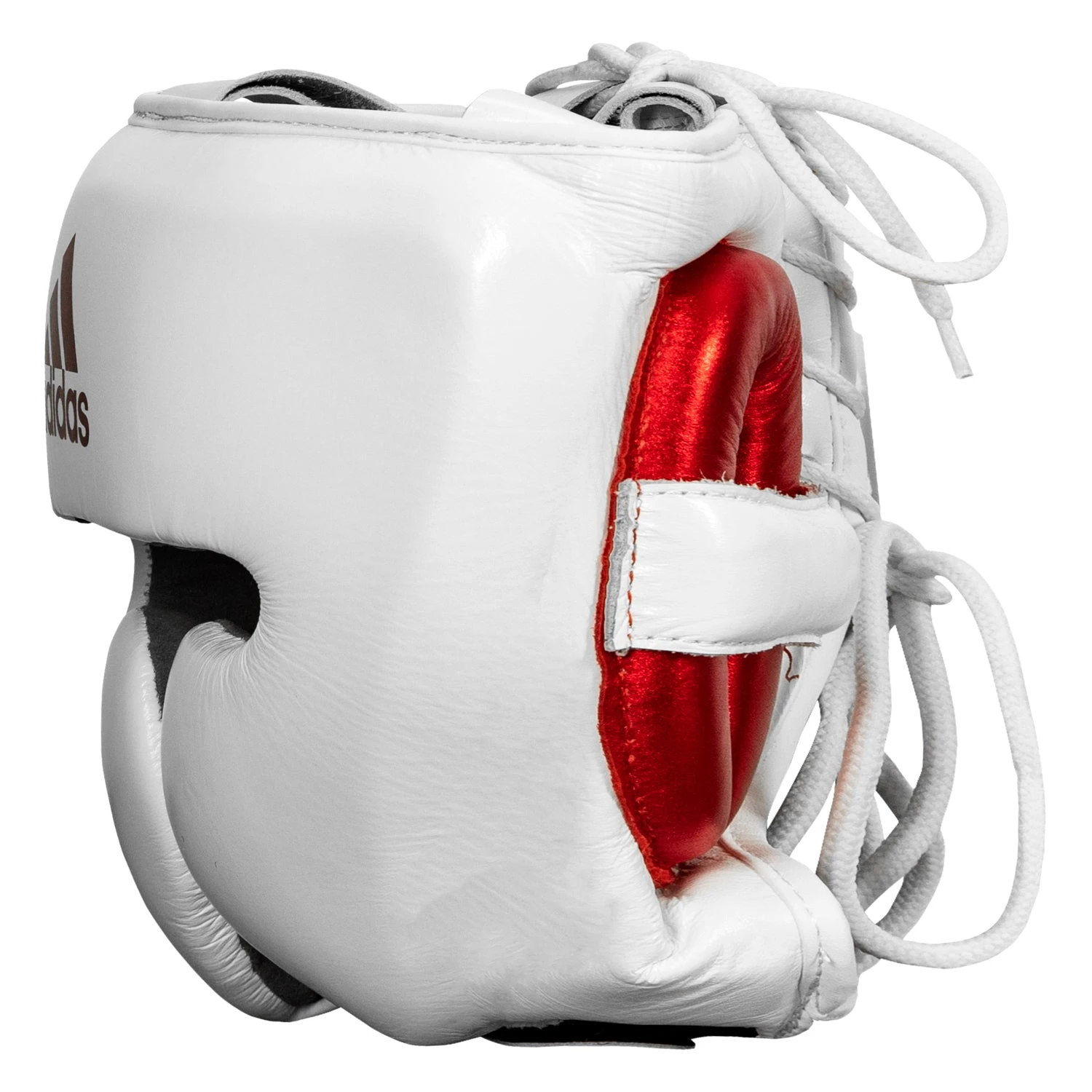 Cowhide leather with amara inside lining. Lace-up closing system on back and top. Multi layered high density EVA foam padding. Hook & Loop chin closing system. The ultimate boxing sparring headgear.