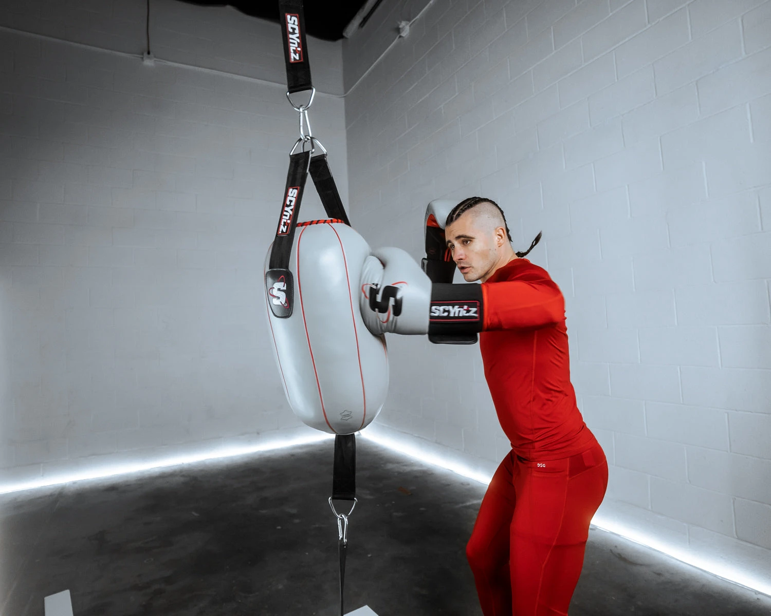 Put the sweet science in motion by combining the perfect blend of the movement of a double end bag, the density of a heavy bag and shape of a body all into one – the SCYntz Leather Double End Heavy Bag. The best bag in your arsenal is built from 1.2mm thick manufactured leather featuring heavy duty top and bottom straps for durability. The entire bag is double stitched with welted seams to make sure it can endure even the most intense workouts time after time. It comes complete with a 36” bungee cord and 24” adjustable strap.